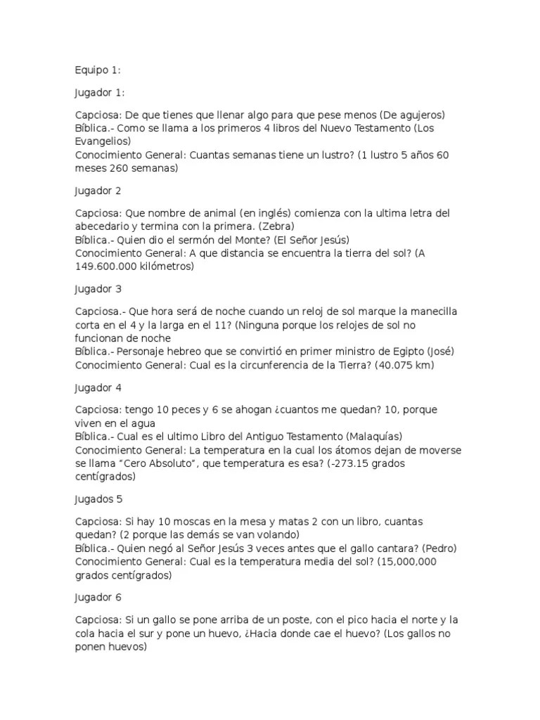 Además, tienes las respuestas justo debajo. Pásalo en grande en tu fiesta con amigos! Como responder una pregunta puede ser fácil, podemos determinar que la penitencia consiste en acertar al menos 3 de 5 preguntas, para que . ¿cuál es el país más . Aquí tienes 215 preguntas de cultura general para que puedas valorar tu nivel de inteligencia y conocimiento. ¿cuál es el océano más grande del mundo? Esta actividad para fortalecimiento del equipo consiste en responder preguntas divertidas y es una opción simple para generar confianza y .